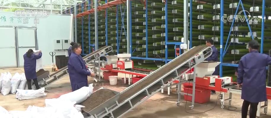 这个玻璃温室大棚,是育秧中心一期工程的主体部分,占地面积2400平方米。它包括循环立体式育秧床、自动播种流水线,还有水肥一体化设备,以及物联网智能控制系统等等。在现场我们看到,之前种粮大户们送过来的早稻种子,工作人员正在有条不紊地进行标准化操作,从放盘、覆土、播种,到后期秧盘输出到叠盘等一系列工序,不到十几秒钟就可完成了,1小时可以实现1000多个秧盘的播种。为了让种子能够准时萌发出土,育秧中心在催芽室内安装了密室智能控制系统,确保温度和湿度更加稳定。48个小时之后,种子发出小嫩芽,就可以出仓到室外进行下一步管护。