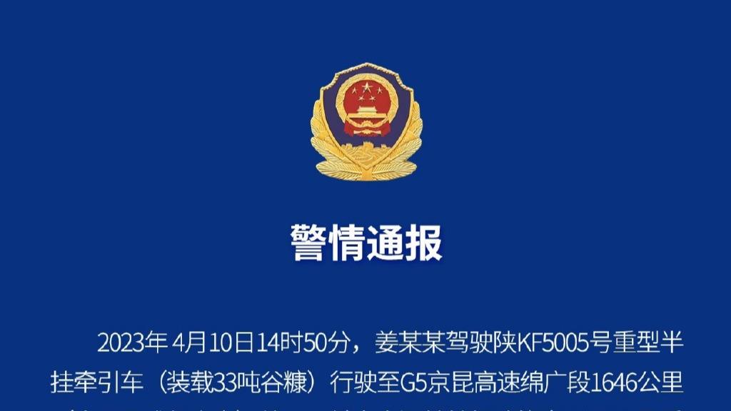 央视网消息:据@四川交警高速二支队微博通报,4月10日14时50分,姜某某驾驶陕KF5005号重型半挂牵引车(装载33吨谷糠)行驶至G5京昆高速绵广段1646公里(广元至成都方向)处,与前方由汤某某驾驶的豫NA3962号重型半挂牵引车发生追尾碰撞,造成陕KF5005号重型半挂牵引车发生燃烧,无人员伤亡的道路交通事故。事故发生后,高速交警和应急救援等相关部门迅速赶赴事故现场,并开展交通管控、灭火施救、交通疏导工作,目前,事故具体原因正在进一步调查之中。