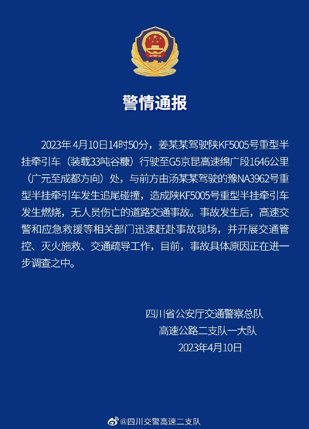4月10日14时50分,姜某某驾驶陕KF5005号重型半挂牵引车(装载33吨谷糠)行驶至G5京昆高速绵广段1646公里(广元至成都方向)处,与前方由汤某某驾驶的豫NA3962号重型半挂牵引车发生追尾碰撞,造成陕KF5005号重型半挂牵引车发生燃烧,无人员伤亡的道路交通事故。