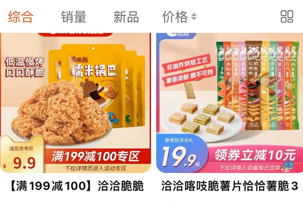 其中,在某电商平台上,其旗舰店中辣条产品的价格显示为72g*4袋18.9元起;果冻价格为120g*2袋19.9元起。