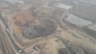 记者当场播放了前一天无人机拍摄的,施工人员从大坑采矿,到运送物料进入加工车间的全部过程。