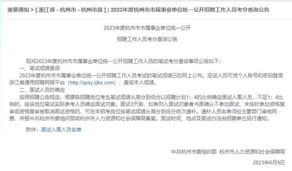 据了解,今年4月23日,2023年杭州市市属事业单位统一公开招聘工作人员公告发布,共推出318个岗位,计划招聘工作人员374名。据公告, 6月5日,浙江省通用招聘网报平台将公布面试入围人员名单,考生本人笔试成绩可同时查询。不过,6月5日杭州市人社局发布公告,称鉴于近期省市考试工作实际,成绩将延迟公布(初步计划于6月9日公布)。