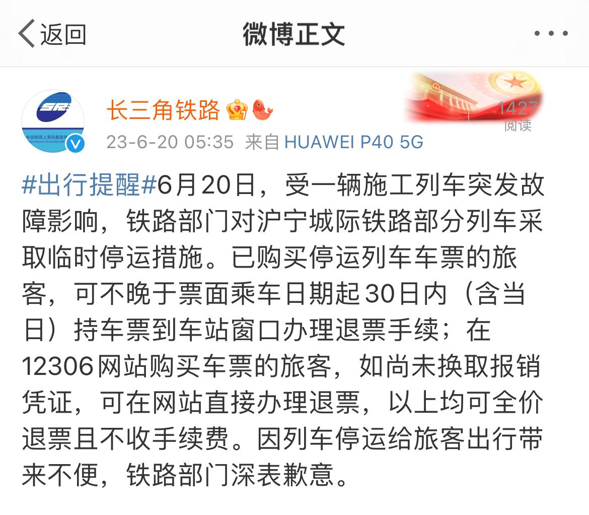 记者6月20日从铁路上海局获悉,受一辆施工列车突发故障影响,铁路部门对沪宁城际铁路部分列车采取临时停运措施。已购买停运列车车票的旅客,可不晚于票面乘车日期起30
