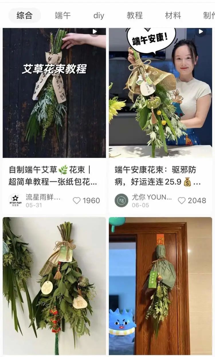 社交媒体平台上,输入“艾草”进行搜索,会出现大量销售艾草花束的账号以及教授如何制作艾草花束的教程,一些艾草花束教程有数千点赞。