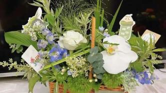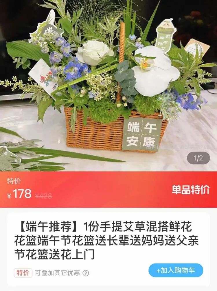 饿了么的线上花店中,艾草花束的品种更多一些,除了花束外,也有花篮。一款178元的花篮有月季、飞燕草、粽叶等植物搭配。