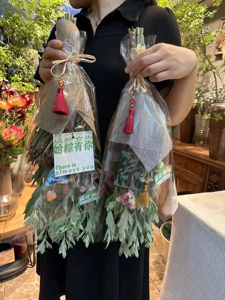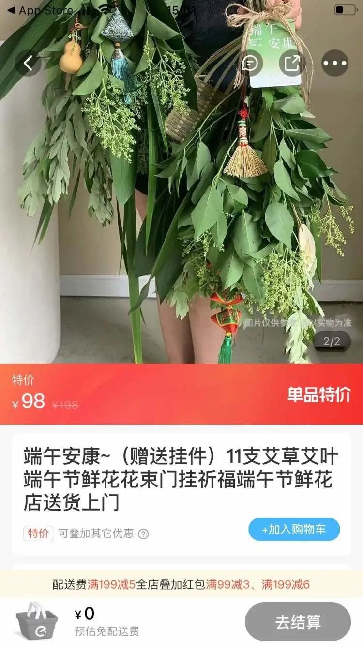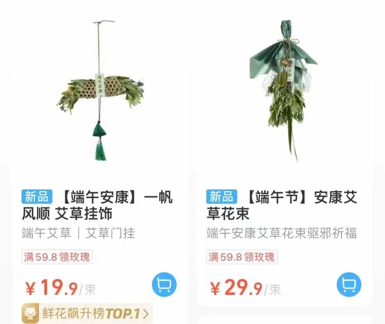 今年,记者在线上平台看到,菜场2元一把的艾草搭配上香囊、葫芦、卡片、洋桔梗等花卉,身价立刻暴涨数十倍,有20元、99元、158元、178元等价位。