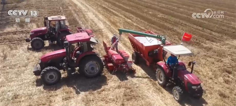 总台记者 王帅南:在我身后的这片地里,正在进行铁茬机械播种。那什么是铁茬机械播种?在小麦机械化收割后,地里就留下了不到二十厘米高的麦茬,土质非常硬,在过去播种玉米时,农民要深翻土地,把这些麦茬打进土里,费时费力,现在用这种夏玉米铁茬播种机,就可以直接在麦茬行间进行播种,省时省力。
