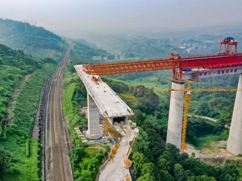 该特大桥上部结构种类多,基本涵盖大多数桥梁上部类型,不仅包括预制架设简支箱梁、支架现浇简支箱梁,还包括64米节段拼装简支箱梁以及2×64米T构连续梁转体,其中节段拼装梁均采用胶结法施工,是渝昆高铁川渝段唯一一座节段拼装梁,共计15跨,单片节段拼装梁最重达到183吨,整跨梁体总重达2500余吨,是目前国内时速350公里高速铁路中单跨最重的节段拼装梁。