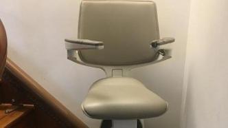 在薛女士家中,记者坐上这把座椅电梯,体验从一楼到二楼运行全过程。刚坐下,座椅就发出尖厉“咯吱”声,在爬梯中始终朝右倾斜,有轻微晃动感。不过,机器在楼梯转角处并未发出她所提到的刺响声。