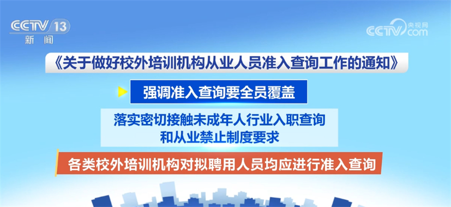 央视网消息:近日,教育部办公厅印发通知,将全面推行校外培训机构从业人员准入查询制度,把好从业人员入口关。