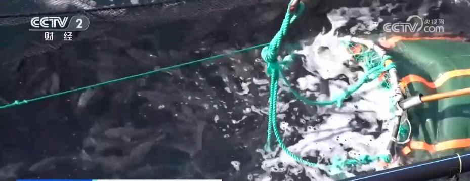 在烟台长岛南隍城海域,随着经海系列深水网箱里鱼类的成熟,一场在大海上的收获正在进行。起降机将一个个装满鱼儿的巨大网兜转移到运输船上,2.5万尾近4万斤的成品黑鲪鱼,将从这里销往全国各地。
