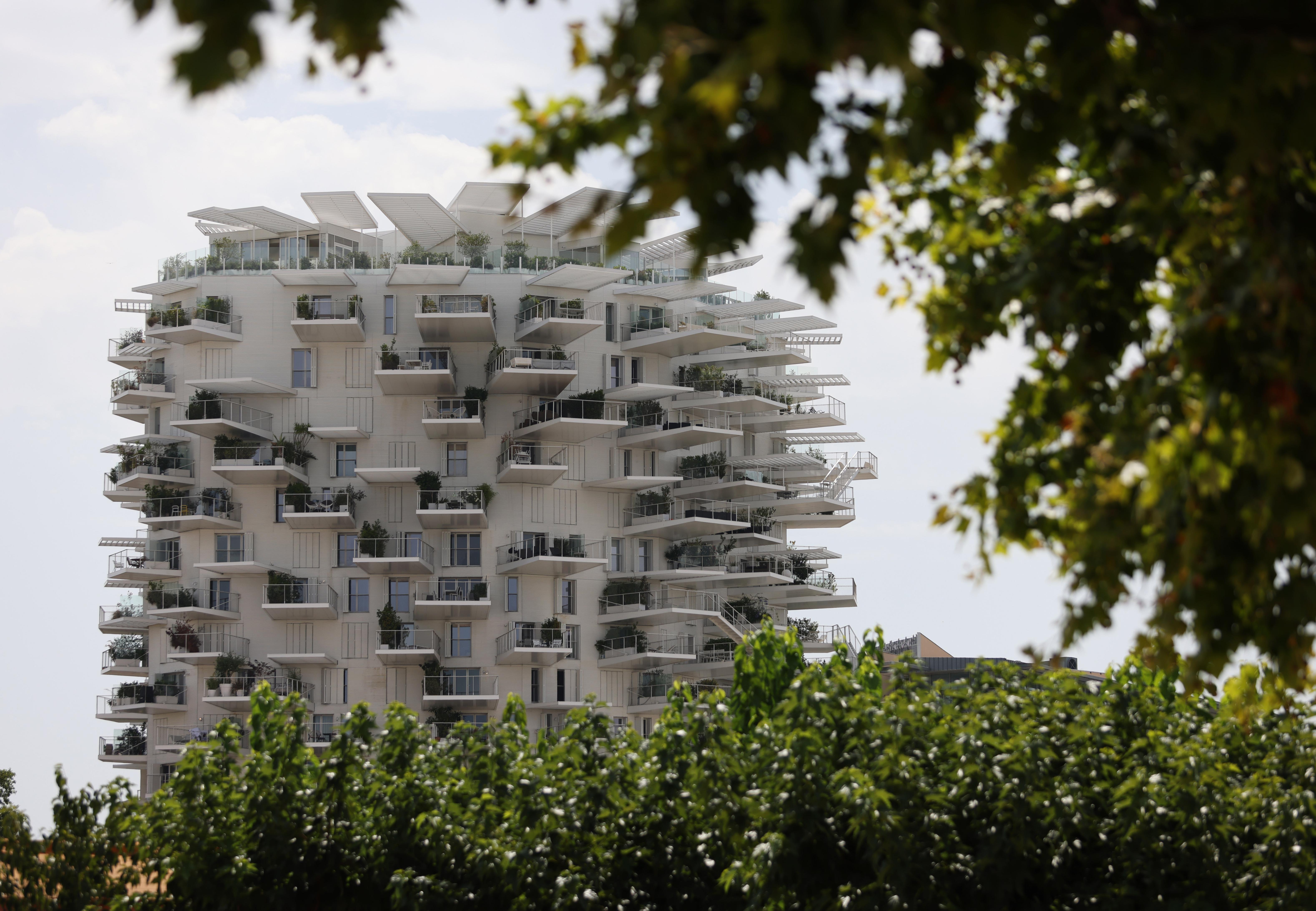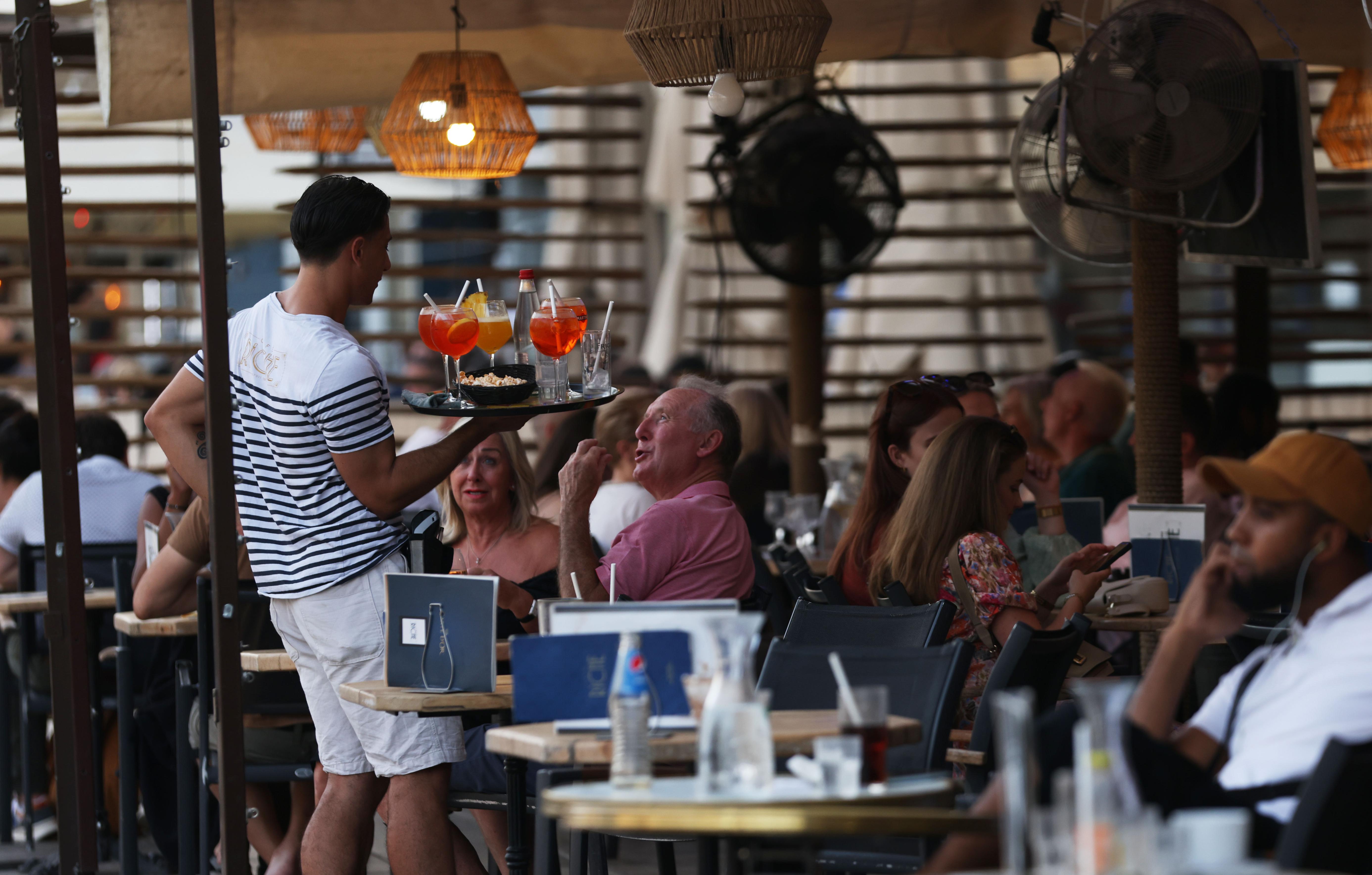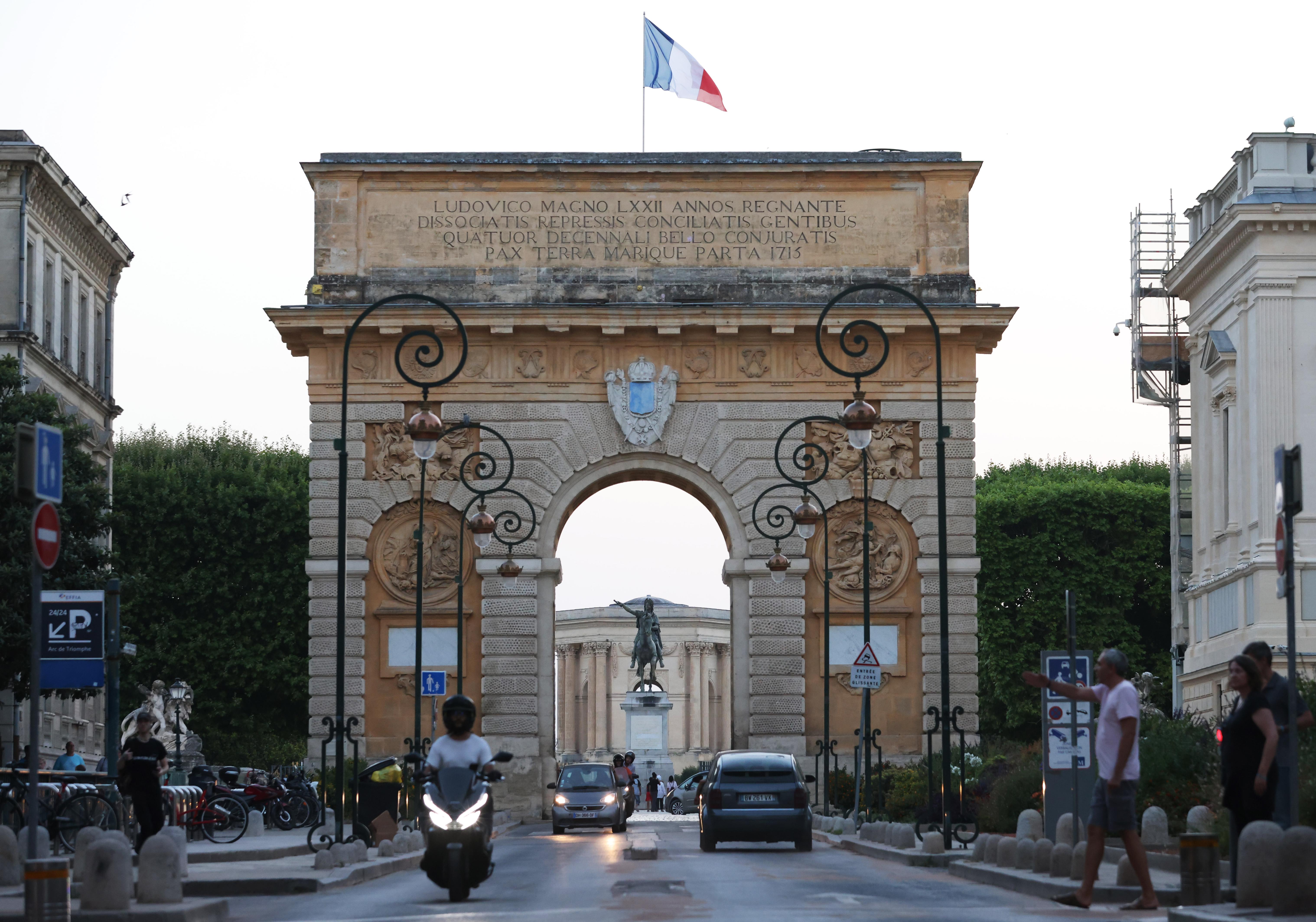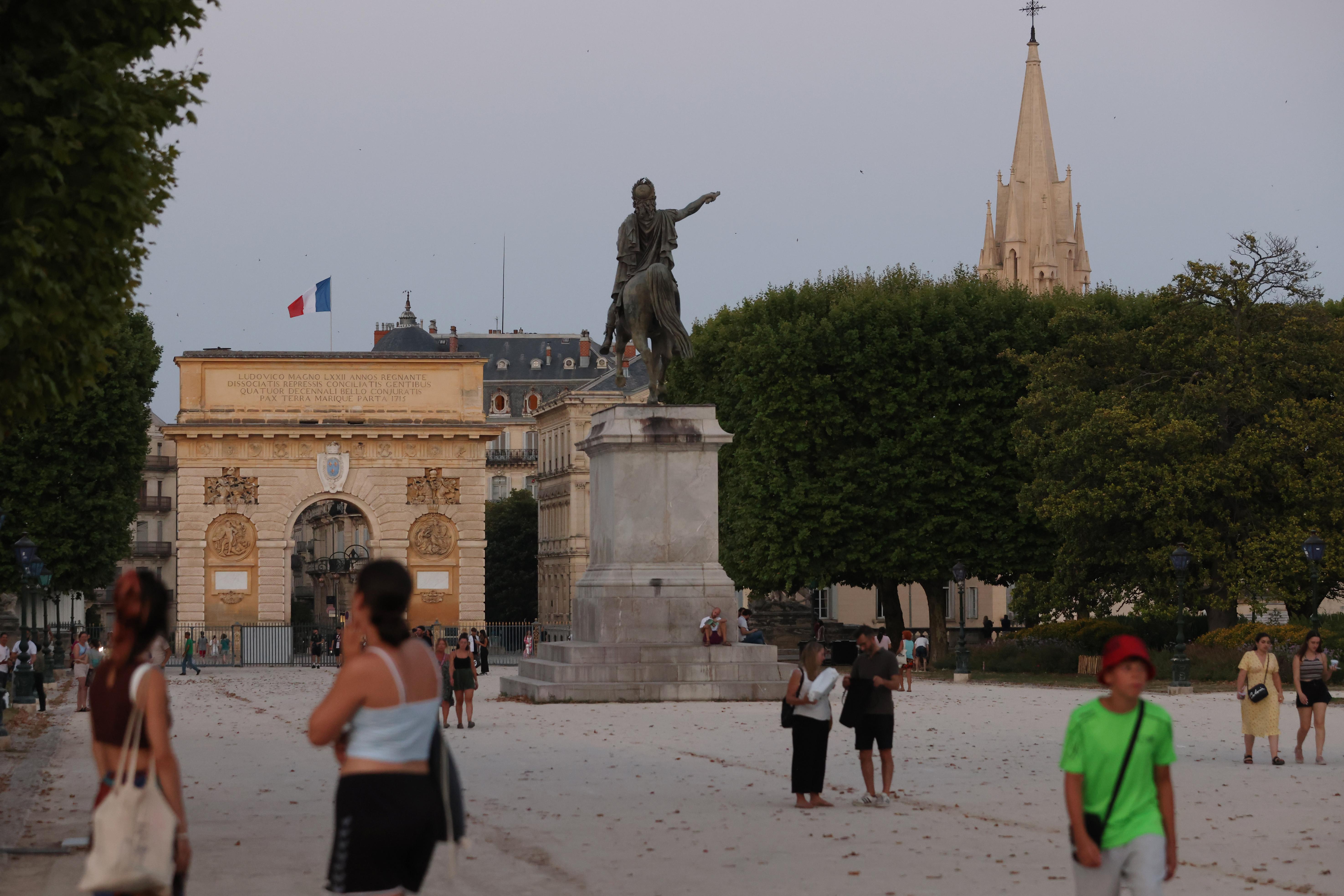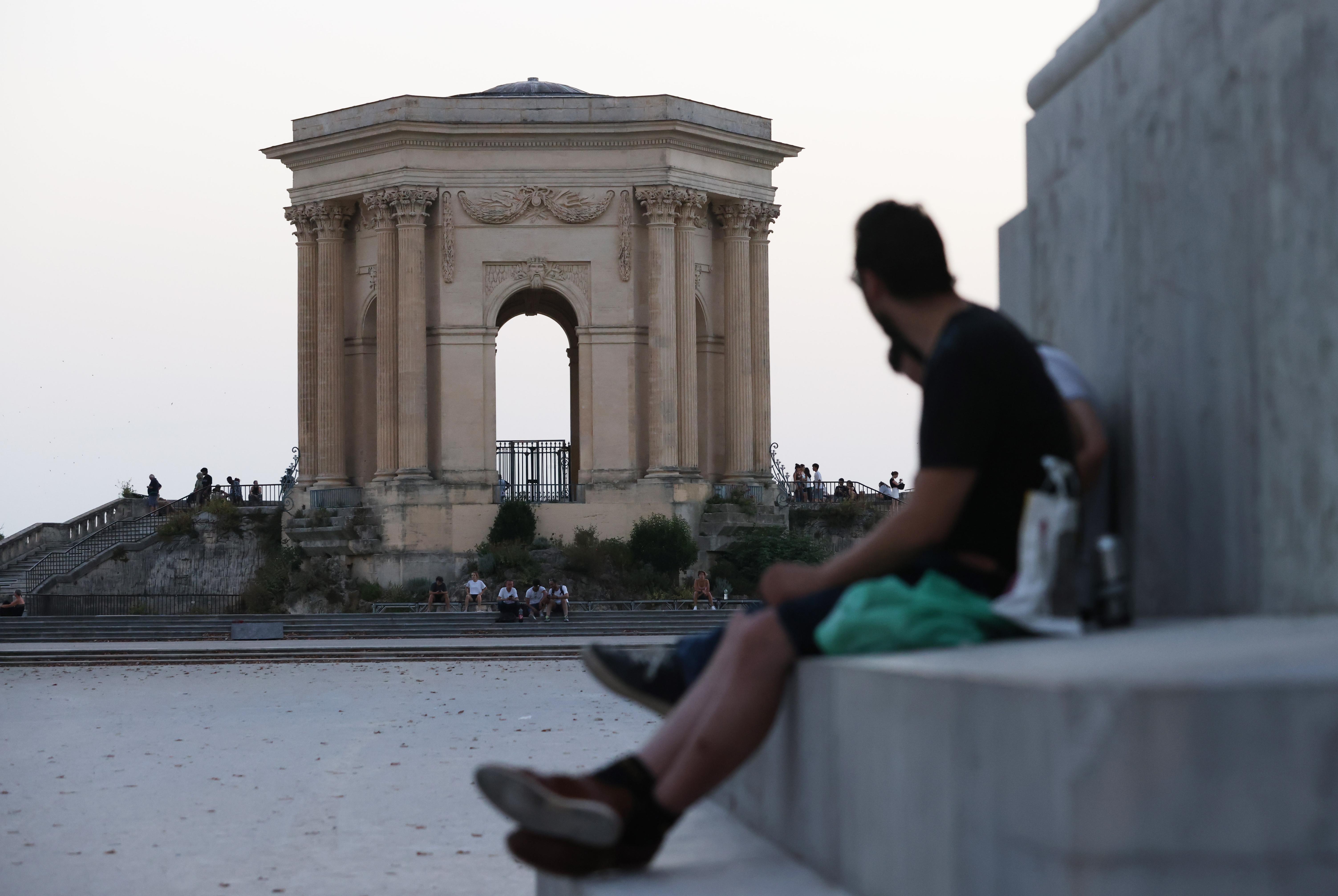 人们在蒙彼利埃的喜剧广场附近就餐休闲。