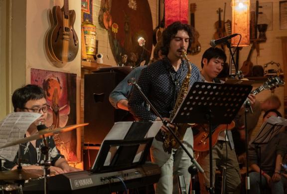 外国友人在成都一家酒馆进行爵士乐演出,他同时还是一所学校的音乐教师。