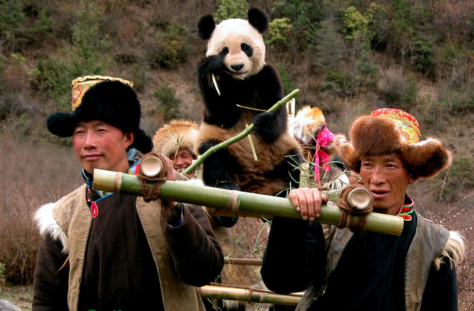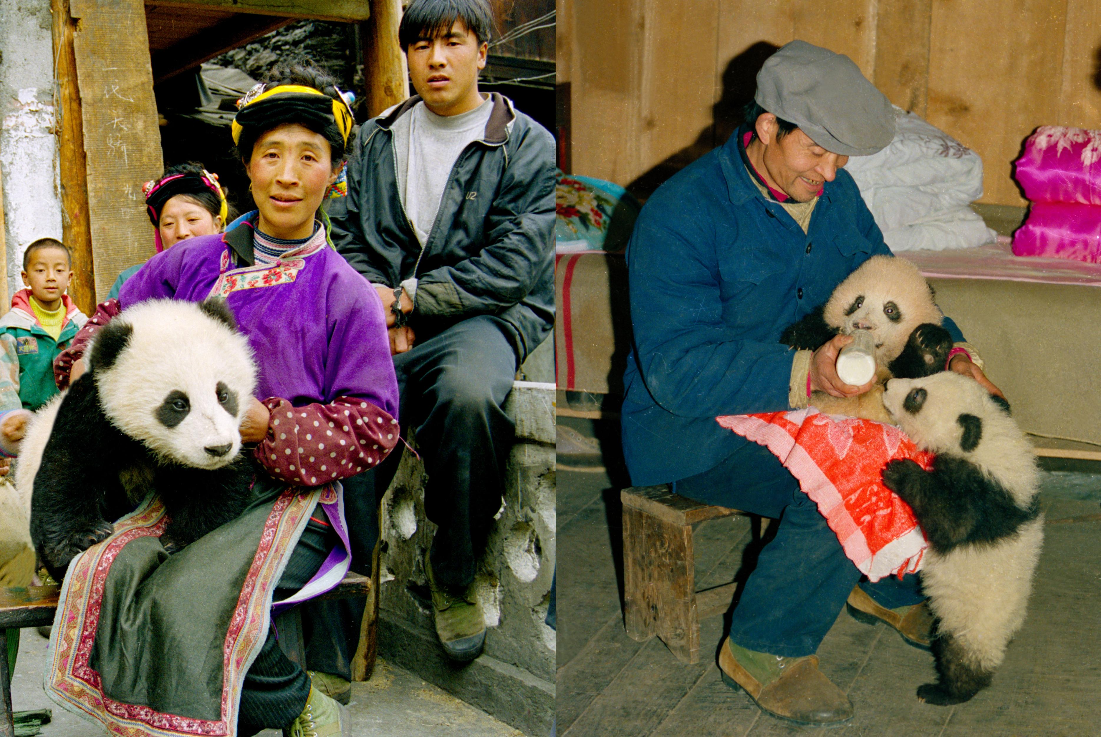 宝兴县村民与大熊猫和谐共处(资料照片,摄于20世纪)。新华社发(宝兴县委宣传部供图)