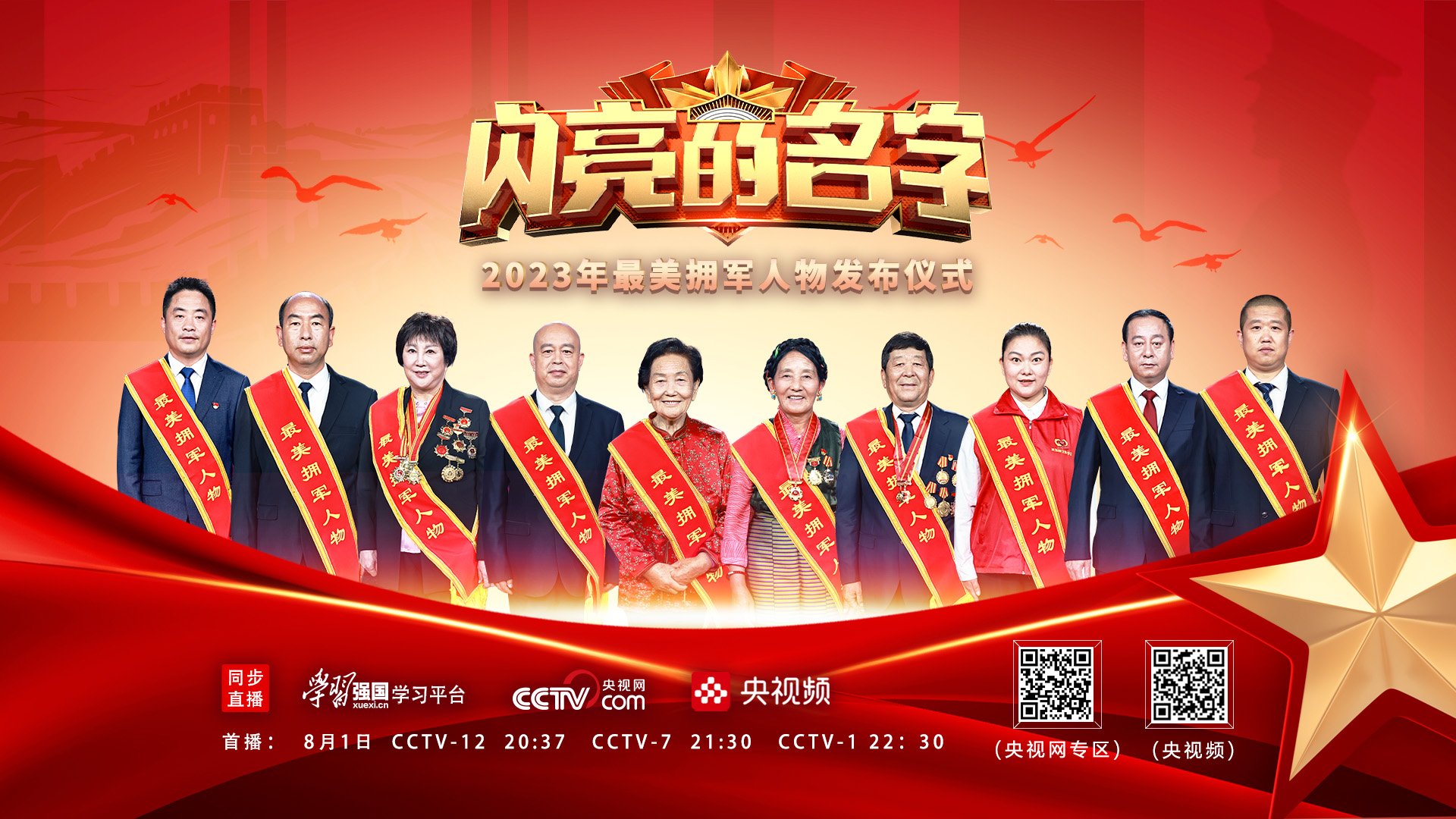 《闪亮的名字——2023年最美拥军人物发布仪式》将在中央广播电视总台央视社会与法频道(CCTV-12)8月1日20:37;央视国防军事频道(CCTV-7)21:30;央视综合频道(CCTV-1)22:30首播。播出期间学习强国、央视频、央视网等新媒体平台同步直播。