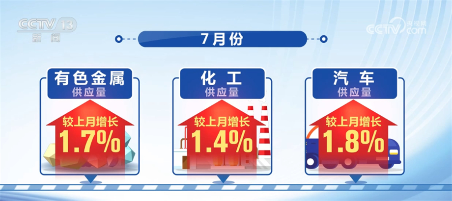 7月份,钢铁、煤炭和成品油供应量较上月分别增加4.6%、7.3%和4.1%,增速较上月分别加快1.4、1.1和1.3个百分点。有色金属、化工和汽车供应量较上月分别增长1.7%、1.4%和1.8%。