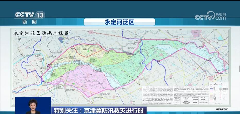 央视网消息:海河流域有八个蓄滞洪区,位于天津以及天津河北交界的有两个,一个是东淀蓄滞洪区,还有一个就是永定河泛区。我们通过永定河泛区防洪工程图来简单了解一下。