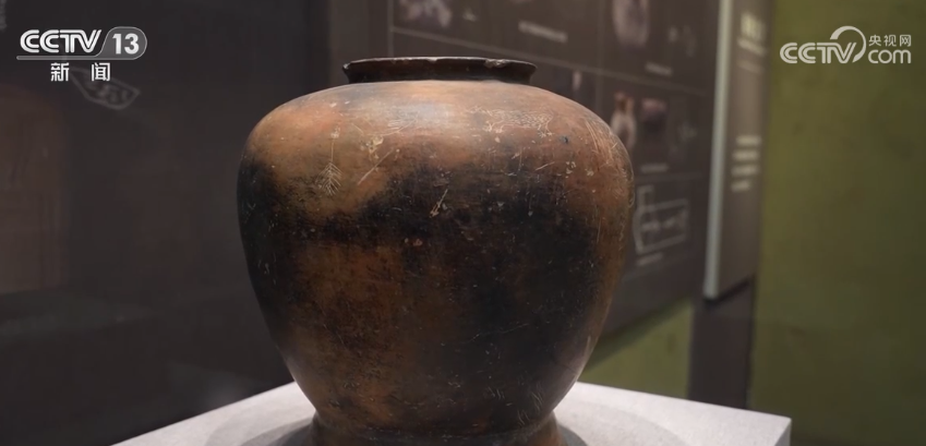 总台记者 朱睿祺:从良渚古城出土的绝大部分文物,真品就收藏在附近的良渚博物院。在第一展厅“水乡泽国”里,我们可以通过出土文物全面了解良渚先民的衣食住行,还能看到当时最主要的生活器物——陶器。在众多黑皮陶中,这件刻符黑陶罐具有独特的研究价值,也是博物院的其中一件“镇馆之宝”。刻符黑陶罐高26.4厘米,口径12.8厘米,腹径25厘米,通俗地讲,就是脖子短、肩膀宽、肚子鼓的圆形容器。刻符黑陶罐在余杭区的南湖被发现,由于长期埋藏于水中,本身是黑陶的它,外表因水锈而呈现大块的红褐色。