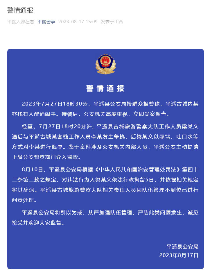 经查,7月27日18时20分许,平遥县古城旅游警察大队工作人员梁某文酒后与平遥古城某客栈工作人员李某发生争执,后梁某文以辱骂、吐口水等方式对李某进行侮辱。鉴于案件涉及公安机关内部人员,平遥公安主动提请上级公安督察部门介入监督。