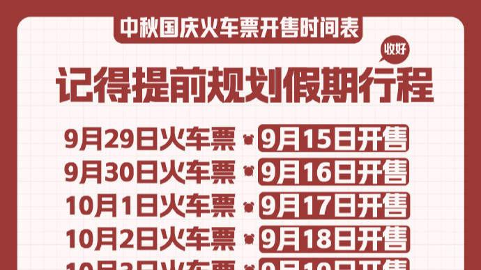 记者从中国国家铁路集团有限公司(以下简称国铁集团)获悉,今年铁路中秋国庆黄金周运输自9月27日开始,至10月8日结束,为期12天,全国铁路预计发送旅客1.9亿人次。9月13日,铁路12306将开始发售中秋国庆黄金周火车票。