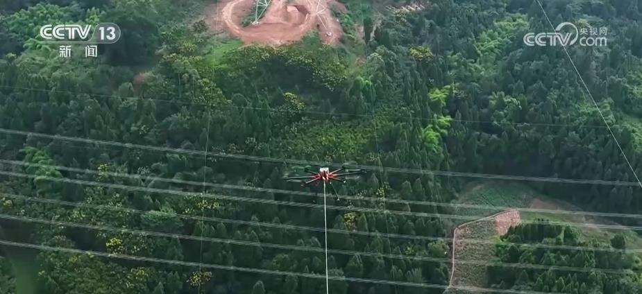 在施工现场,工作人员操作无人机,带着牵引绳缓缓升空,在140米的高空,带动重量达到6吨的导线,缓缓跨过500千伏嘉林线上空,最终架设在两基170多米高、间距400米的铁塔间。