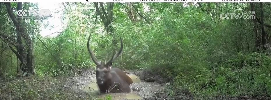 水鹿也出现在了镜头里。2023年4月,水鹿先是上前亲吻相机,发现不对劲先是被吓了一跳,然后立马跑开。还有的水鹿或双脚直立、或在水坑中洗澡,十分悠闲自在。