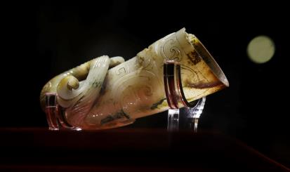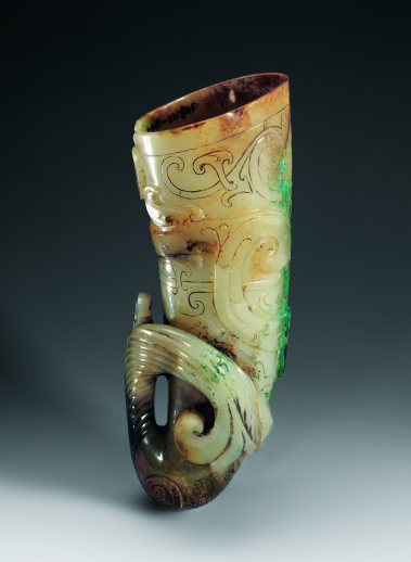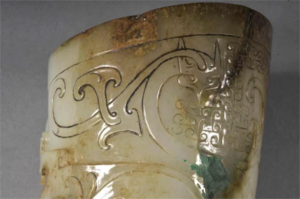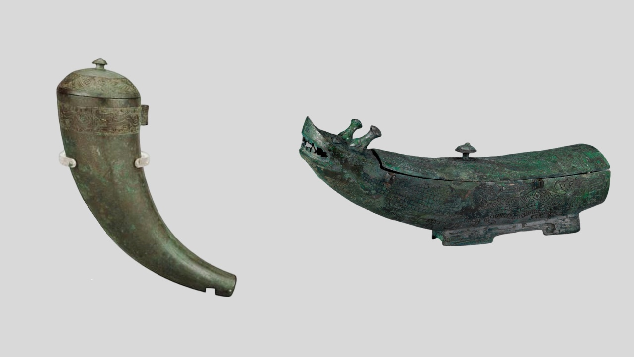 △左:安阳殷墟王陵区中出土的夔龙纹铜质角形器;右:石楼桃花庄出土的龙纹觥