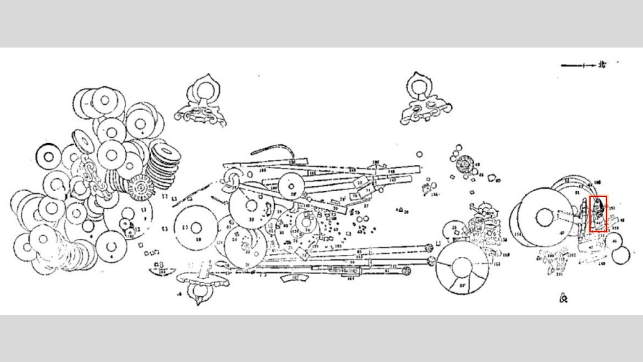 △ 南越文王棺椁里面的“内棺”“头箱”“足箱”器物分布平面图,红色线框内为角形玉杯。