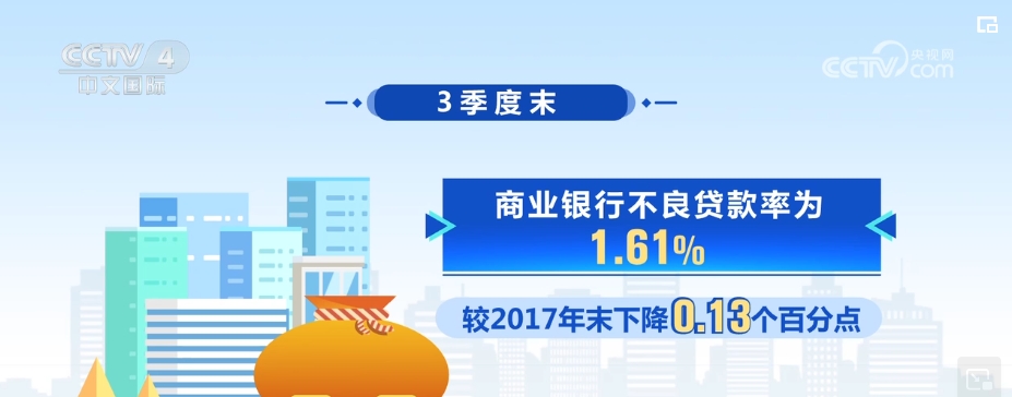 三季度末,商业银行不良贷款率为1.61%,较2017年末下降0.13个百分点。保险方面,三季度末,保险公司总资产29.6万亿元,是2017年末的1.77倍。