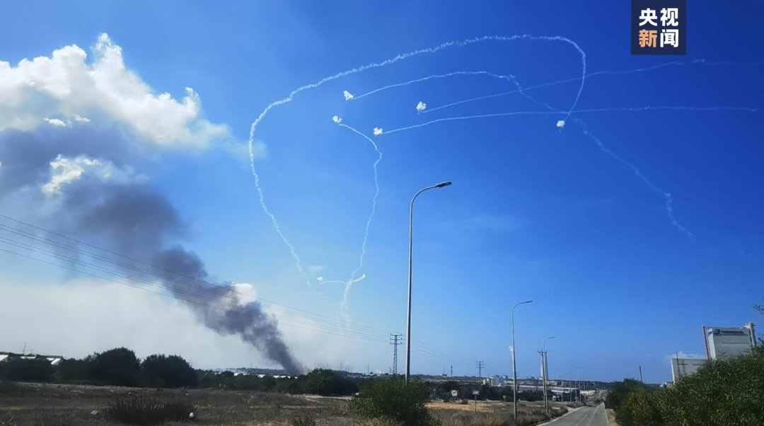 △“铁穹”拦截瞬间。其中一枚火箭弹未能成功拦截,掉落在阿什凯隆工业区。