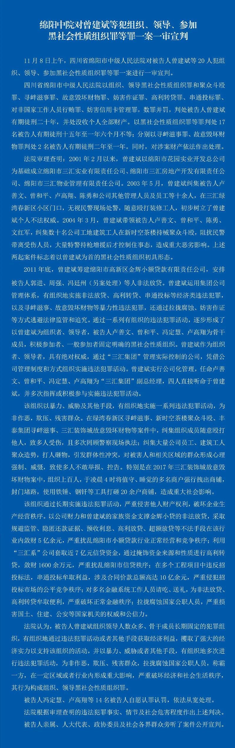 11月8日上午,四川省绵阳市中级人民法院对被告人曾建斌等20人犯组织、领导、参加黑社会性质组织罪等罪一案进行一审宣判。