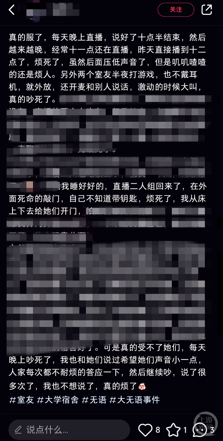 在某社交平台搜索“室友在宿舍直播”,上游新闻记者发现超过50篇笔记都是有关大学生寝室直播引发室友不满:“每天晚上吵死了,我也和她们说过希望她们声音小一点,人家每次都不耐烦地答应一下,然后继续吵”“我觉得在寝室直播就是不合适啊,但是想不到什么严肃有效的理由让她不直播,求大家帮忙出谋划策一下”……