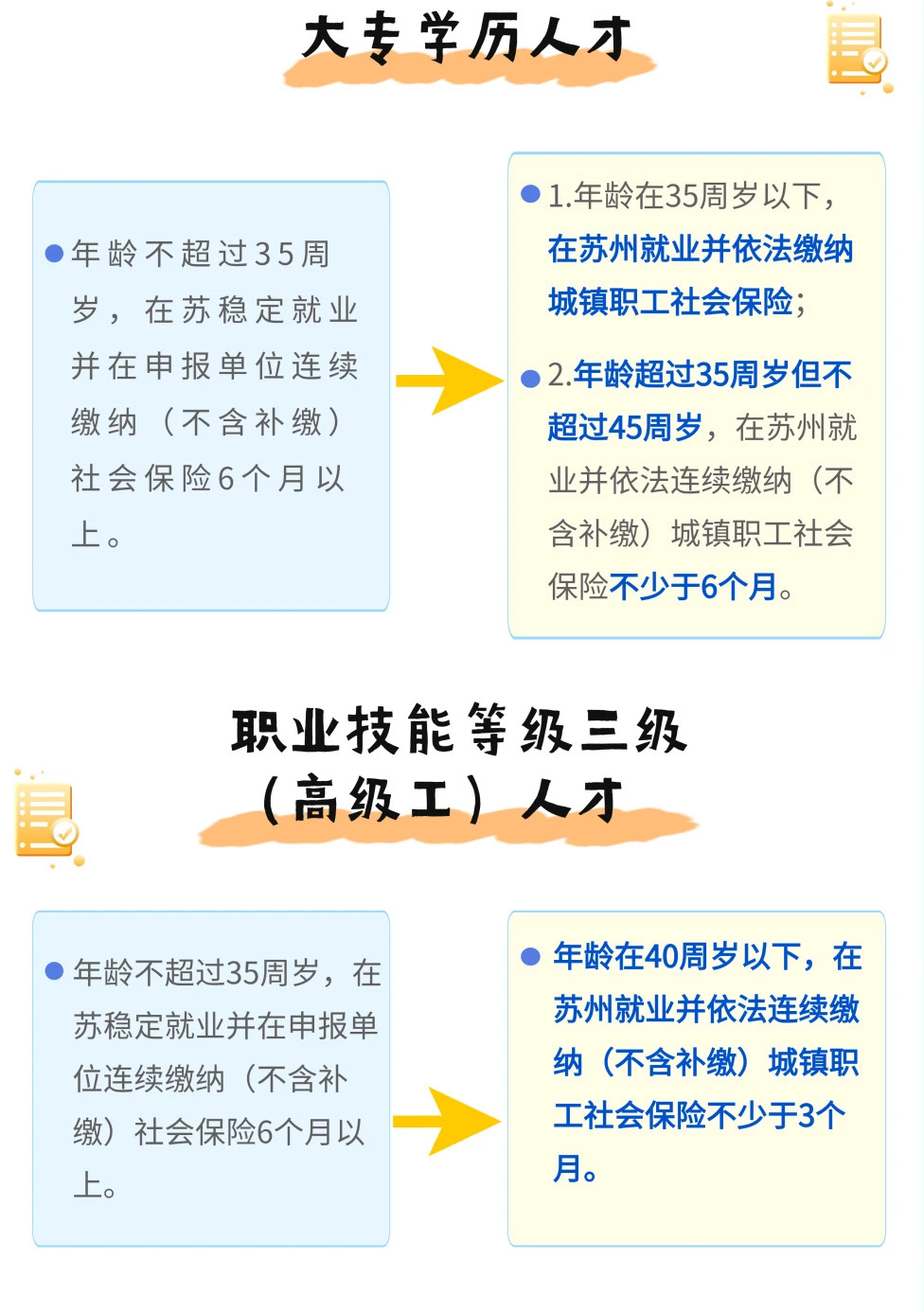 2.符合苏州市引进技能人才紧缺(工种)目录的职业技能等级三级(高级工)社保缴费年限、年龄放宽:年龄条件从35周岁放宽至40周岁,连续缴纳社保时间从6个月缩减为3个月。