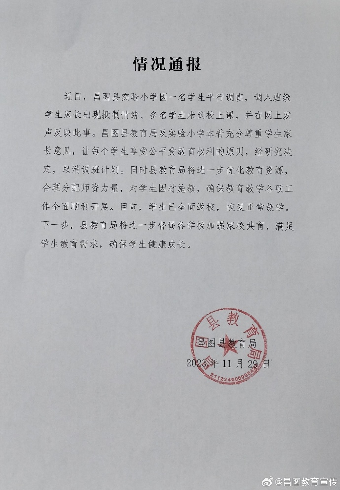 央视网消息:据@昌图教育宣传 微博消息,11月29日,辽宁昌图县教育局通报网传“学校安排‘问题学生’转入引全班罢课”情况:近日,昌图县实验小学因一名学生平行调班,调入班级学生家长出现抵制情绪、多名学生未到校上课,并在网上发声反映此事。昌图县教育局及实验小学本着充分尊重学生家长意见,让每个学生享受公平受教育权利的原则,经研究决定,取消调班计划。同时县教育局将进一步优化教育资源,合理分配师资力量,对学生因材施教,确保教育教学各项工作全面顺利开展。目前,学生已全面返校,恢复正常教学。