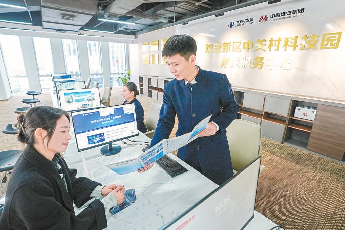 雄安新区中关村科技园集成服务中心可为入驻企业提供可一站式服务。图为工作人员在现场进行讲解。 本报记者 武亦彬摄