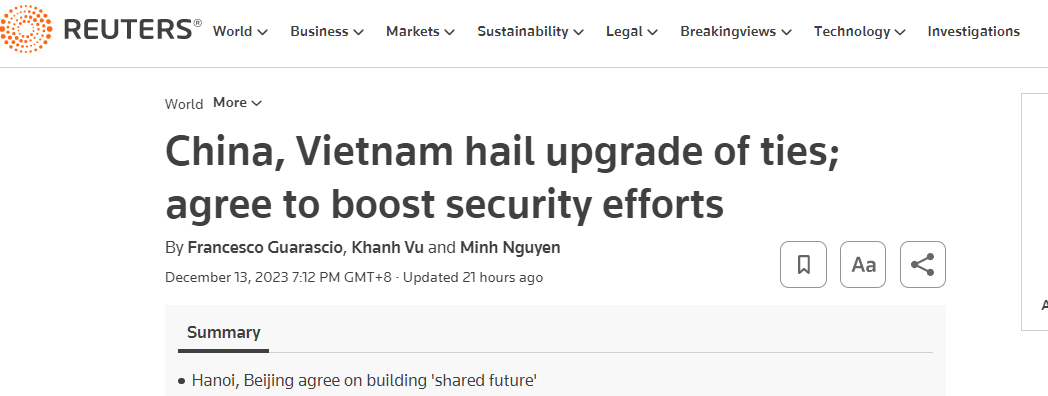 路透社12月13日报道称,中国和越南宣布,两国签署了数十项合作协议,同意加强安全事务合作,共同构建“命运共同体”。