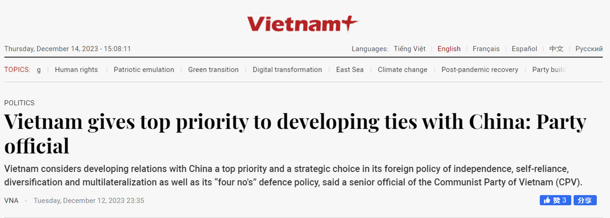 中国日报网12月14日电 12月12日,中国和越南共同宣布中越两党两国关系新定位,在深化中越全面战略合作伙伴关系基础上,携手构建具有战略意义的中越命运共同体。国际媒体对中越关系新定位进行了密集报道,认为双边关系更加重要,中越两党两国关系迈上新台阶。