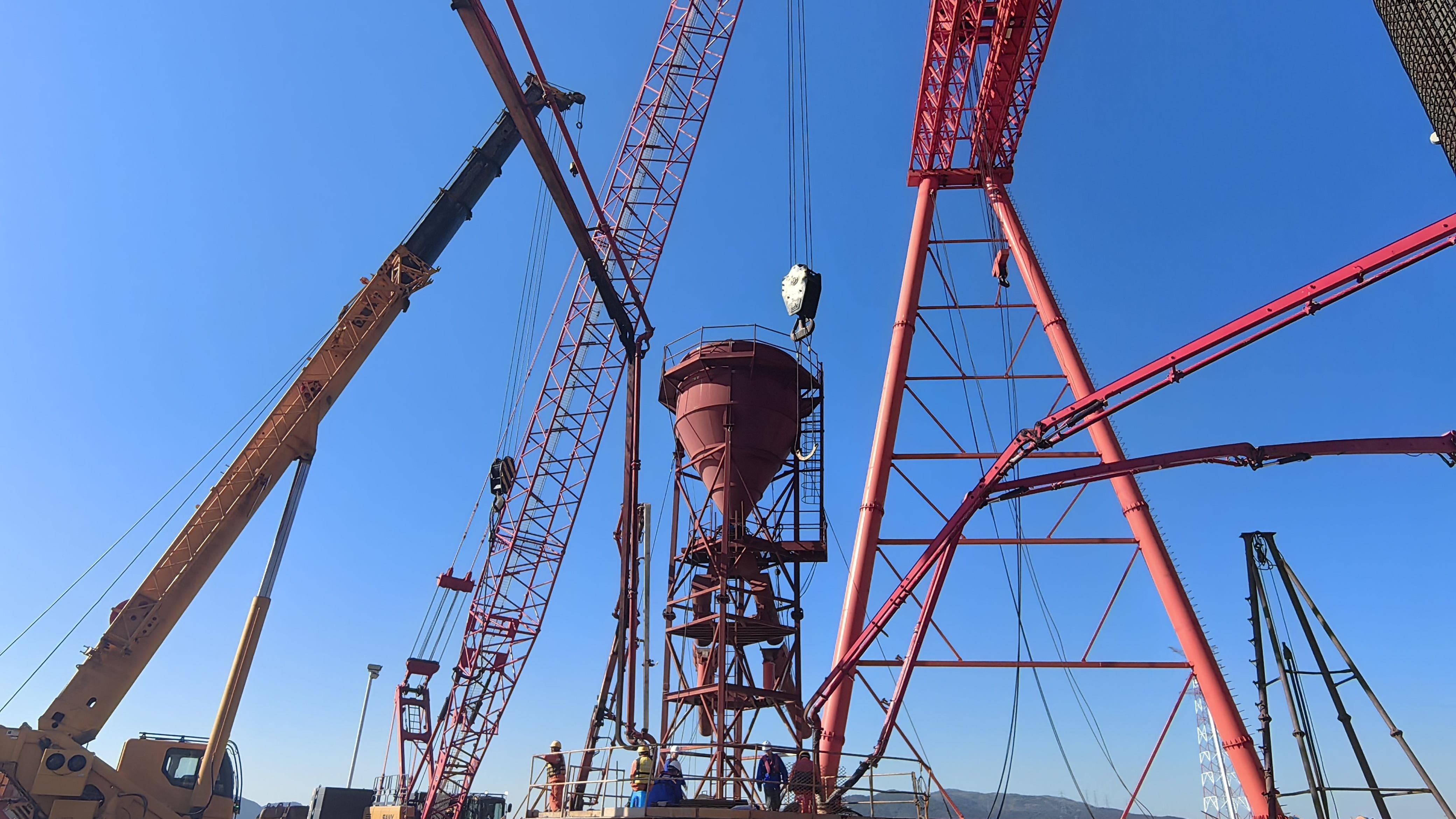 西堠门公铁两用大桥桥位处最大水深60米,最大流速4.1米/秒,全年6级及以上大风超过100天,具有“风大、浪高、水深、流急、裸岩”等环境特点。大桥共有8个桥墩,其中5号、4号分别为东西两个主塔墩,其中5号主塔墩采用18根6.3米世界最大直径钻孔桩基础,设计桩长84米,嵌岩深度约37米,建设施工难度大,自2023年7月正式开钻以来,中铁大桥局研发投入了大量新设备、新工艺,圆满完成钻孔桩施工作业,较原计划桩基工期大大提前。
