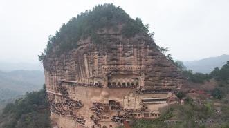 4月5日,游客在位于天水市麦积区的麦积山石窟游览(无人机照片)。新华社 图