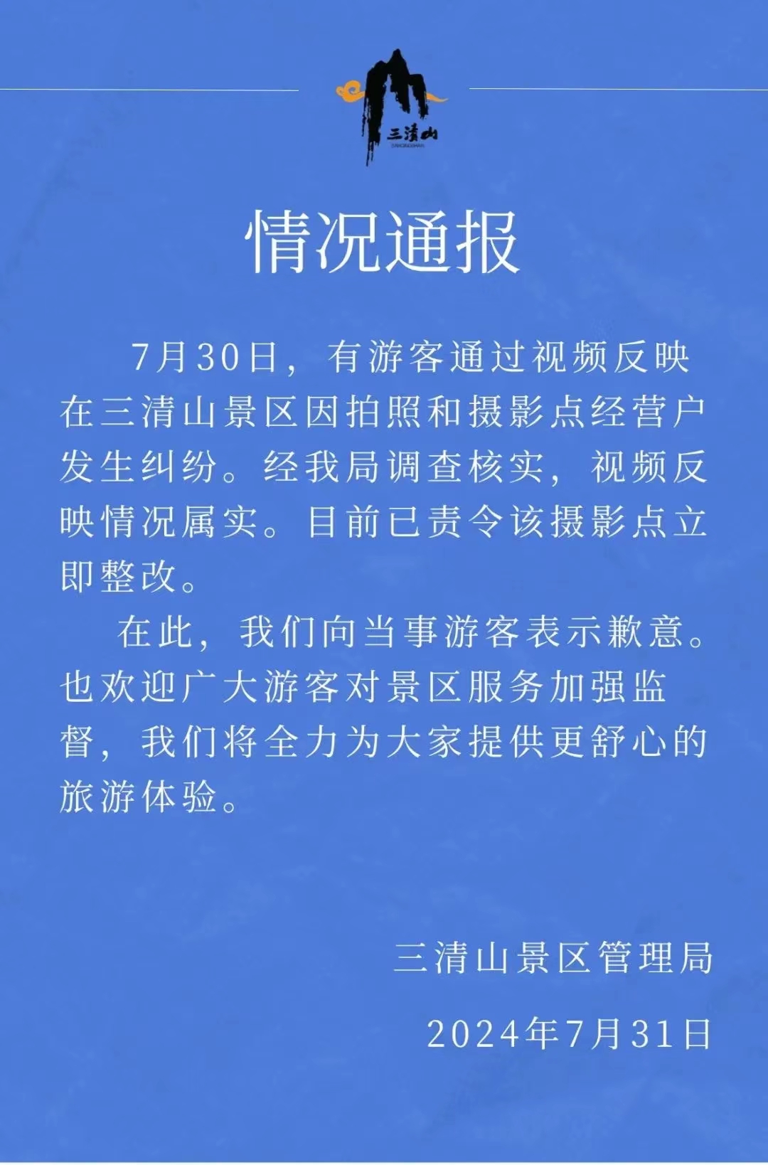7月30日,有游客通过视频反映在三清山景区因拍照和摄影点经营户发生纠纷。经三清山景区管理局调查核实,视频反映情况属实。目前已责令该摄影点立即整改。