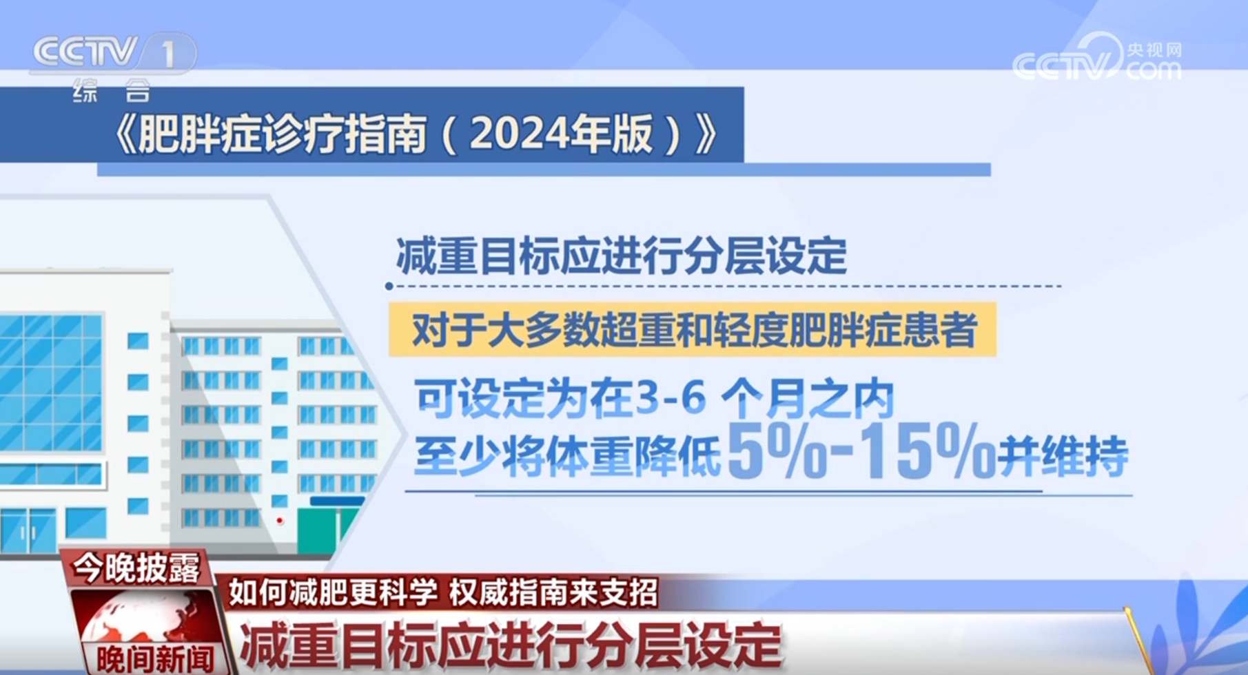 《肥胖症诊疗指南(2024年版)》明确了肥胖症的治疗原则,指出肥胖症治疗的主要目的在于减少蓄积在体内过多的脂肪,降低肥胖症相关疾病的发生风险。而在减重过程中,需关注脱水、肌少症和内分泌系统的变化。建议每3—6个月,对减重效果和代谢指标进行评估。对于大多数超重和轻度肥胖症患者,可设定为在3—6 个月之内,至少将体重降低5%—15%并维持;对于中、重度肥胖症患者,则可设定更高的减重目标。