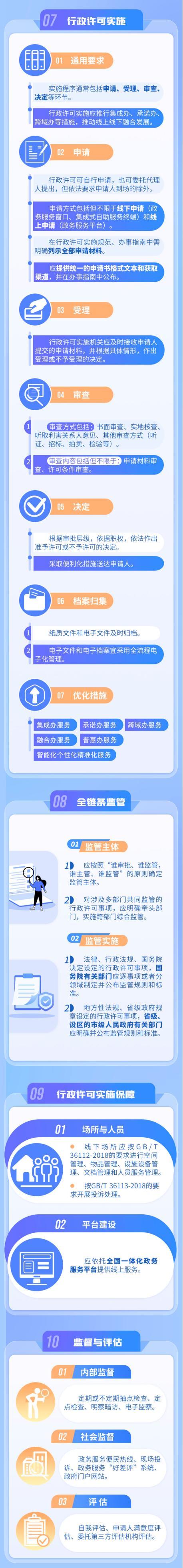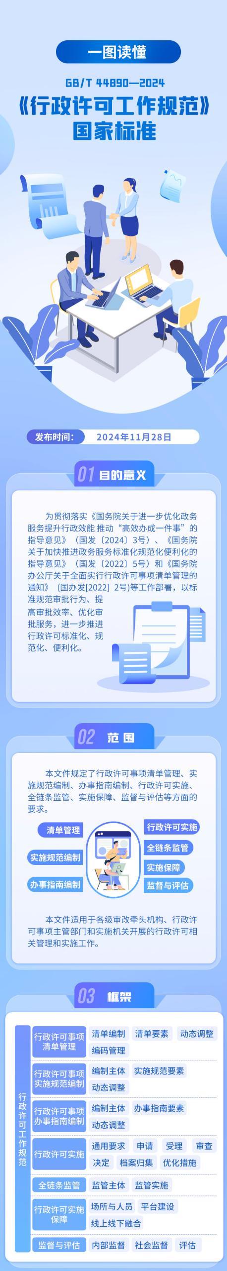 《行政许可工作规范》国家标准,规定了行政许可事项清单管理、实施规范编制、办事指南编制、行政许可实施、全链条监督、行政许可实施保障、监督与评估7方面要求。
