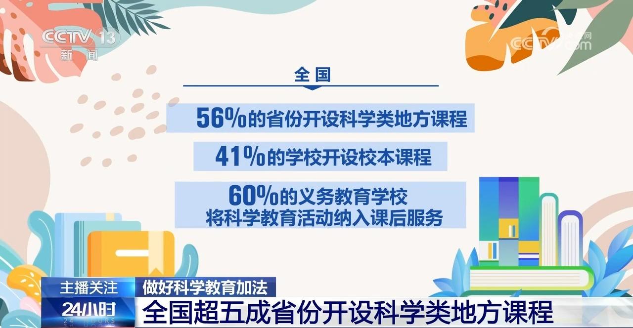 全国56%的省份开设了科学类地方课程,41%的学校开设校本课程,60%的义务教育学校将科学教育活动纳入课后服务。