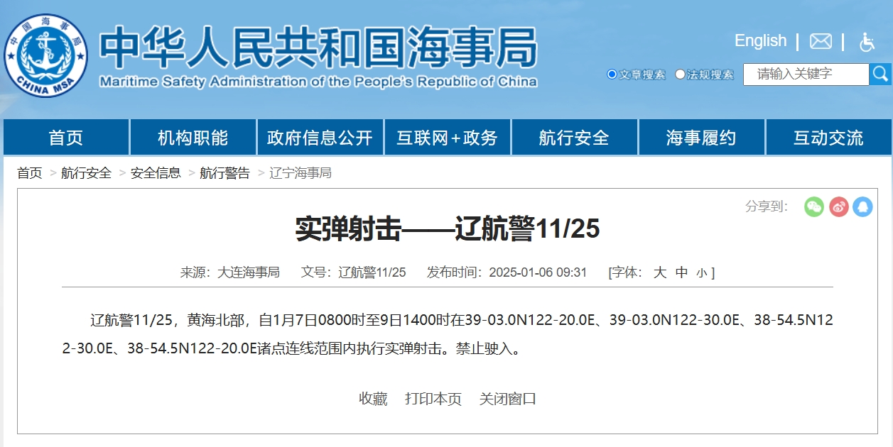 大连海事局发布航行警告,1月7日8时至9日14时,黄海北部部分海域执行实弹射击,禁止驶入。