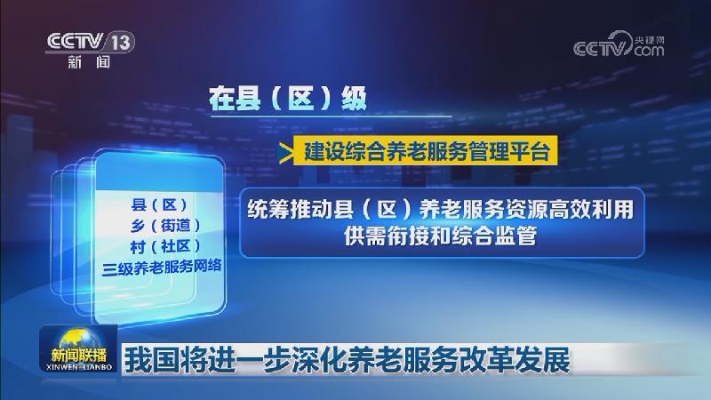 央视网消息(新闻联播):1月9日,国务院新闻办公室举行新闻发布会,多部门介绍我国进一步深化养老服务改革发展新举措,我国将充分发挥养老服务事业发展政府主导、市场配置资源、社会参与等作用,加快健全覆盖城乡的三级养老服务网络。在县(区)级,建设综合养老服务管理平台,统筹推动县(区)养老服务资源高效利用、供需衔接和综合监管。在乡镇(街道)级,建设区域养老服务中心,发挥政策咨询、服务转介、资源链接等作用。在村(社区)级,大力发展嵌入式社区养老服务设施和互助型养老服务站点,成为老年人家门口的服务站。