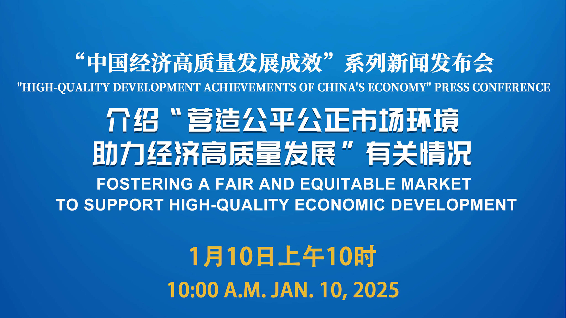 央视网消息:2025年1月10日(星期五)上午,国务院新闻办公室举行“中国经济高质量发展成效”系列新闻发布会,请市场监管总局副局长束为介绍“营造公平公正市场环境,助力经济高质量发展”有关情况,并答记者问。