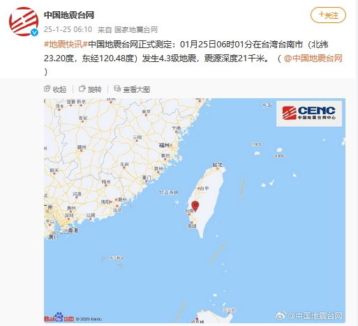 央视网消息:中国地震台网正式测定:01月25日06时01分在台湾台南市(北纬23.20度,东经120.48度)发生4.3级地震,震源深度21千米。