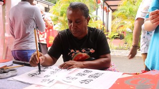 一名当地民众在体验书法。中国驻塞舌尔大使馆供图