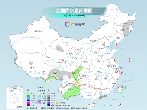 今天,南方降水将向西收缩,主要出现在西南地区东部至华南西部;北方降雪仍集中在东北地区和山东半岛。明天起,全国大部进入雨雪稀少的天气格局。