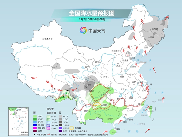 央视网消息:据中国天气网,今明两天(2月7日至8日),寒潮继续影响我国,中东部气温将陆续迎来这轮过程的最低点,并将大面积创今冬以来气温新低。同时,全国降水范围有所缩减,主要出现在东北地区、西南地区东部、华南西部等地,强度不大,以小到中雨雪为主,眼下仍是出行出游高峰期,公众需注意防范低温、大风、降水天气带来的不利影响。